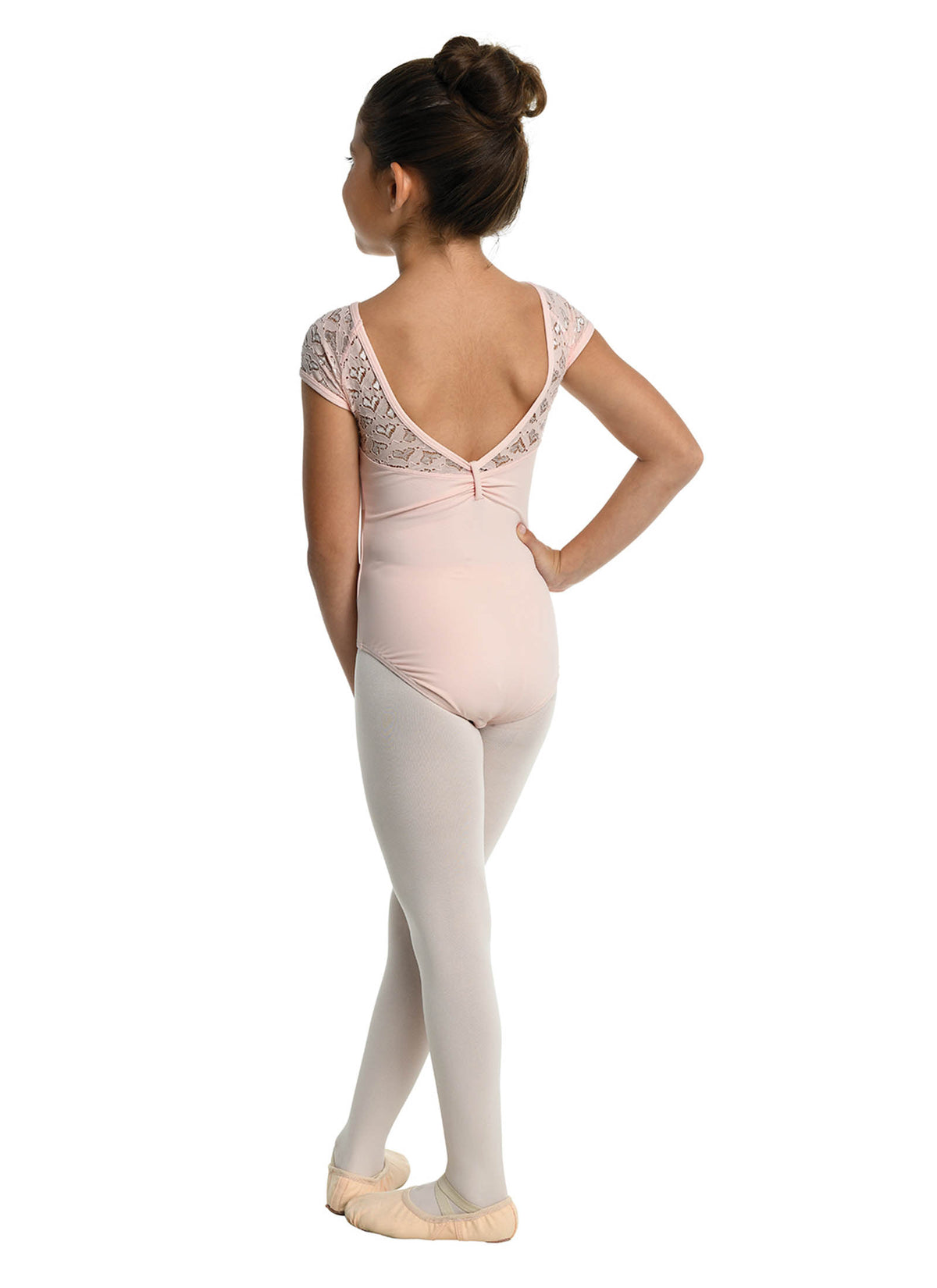 Raglan cap sleeve leotard featuring heart motif lace contrast at yoke, sleeves and back